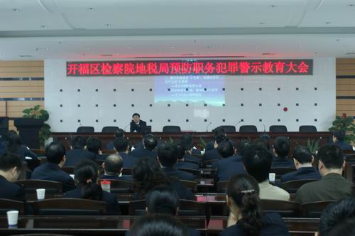 326日,开福区检察院、地税局开展了一次预防职务犯罪警示教育活动。全院干警和开福区地税局干部三百余人集结在一起,听取省检察院预防职务犯罪处副处长饶立明同志的讲课。